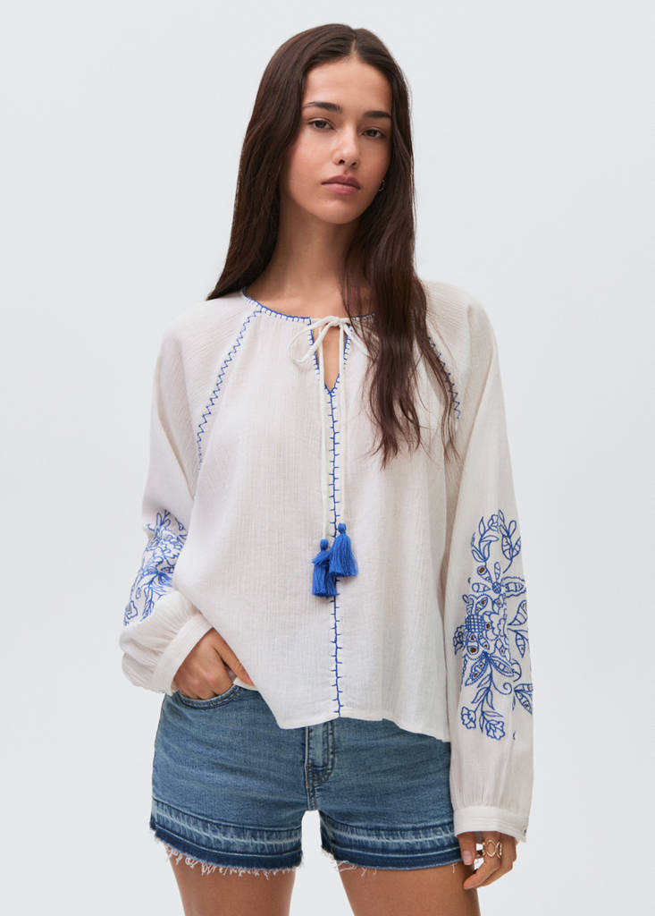 Cotton fabric. Straight design. Belt loops. Zip and button closure. Two pockets. Two patch pockets at the back. Frayed hem