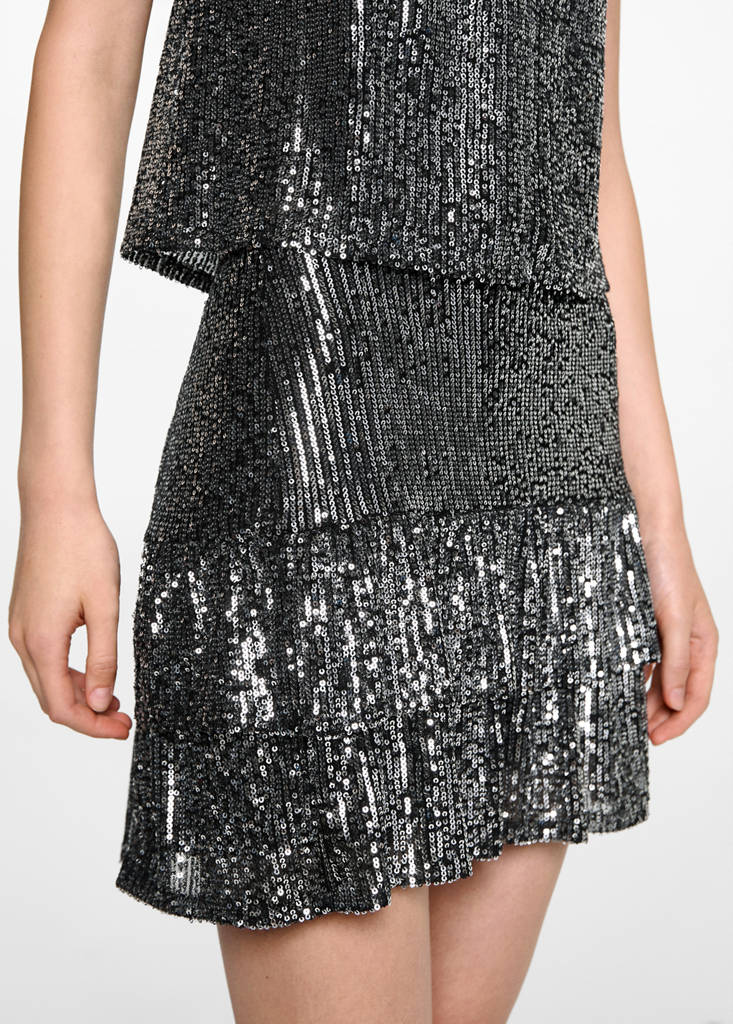 Side closure. Short design. Fabric with sequin. Ruffled design. Total look. Party and events collection. Party Collection