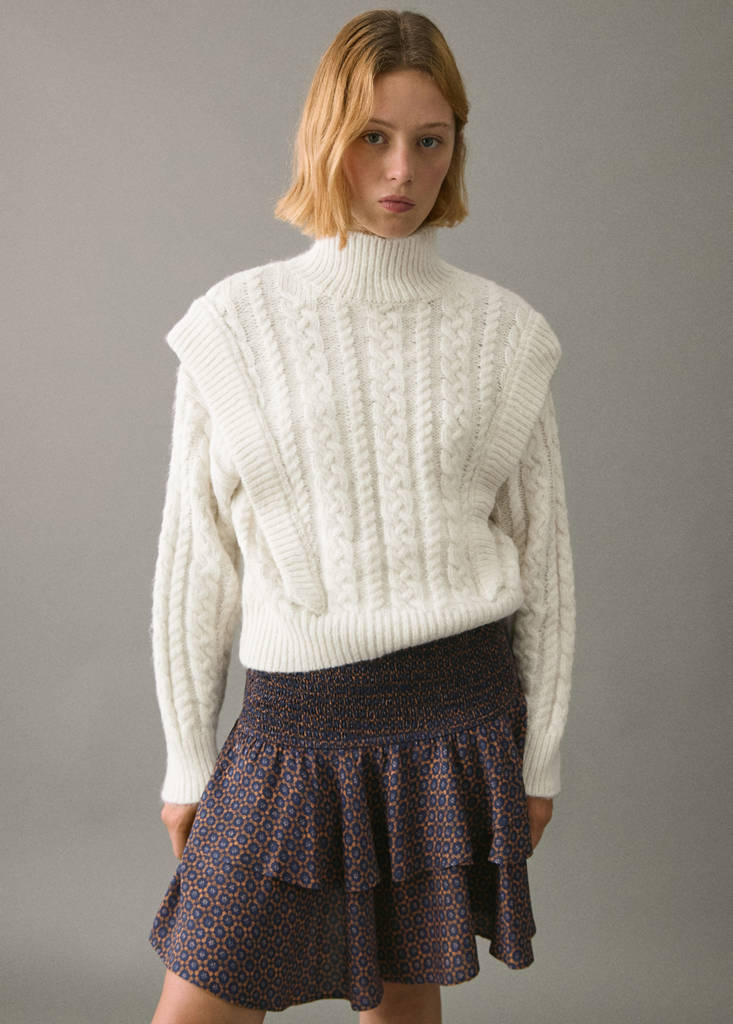 Fluid fabric. 100% viscose. Printed design. A-line design. Smocked elastic waist. Ruffles on the hem. Total look