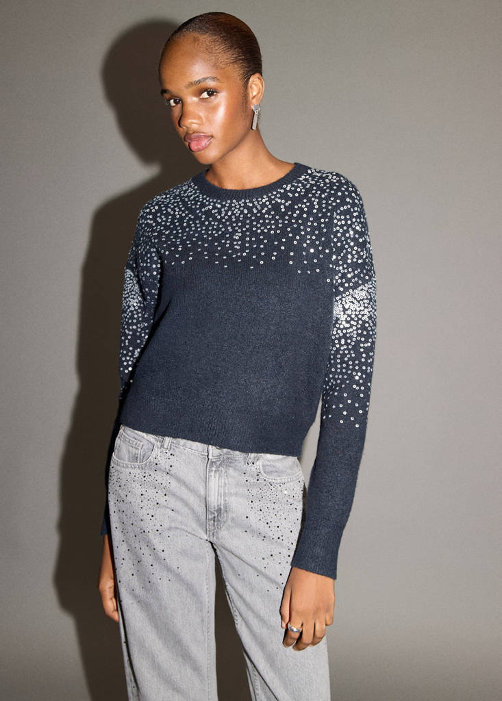 Knit fabric. Wool fabric. Straight design. Round neck. Long sleeves. Sequin detail. Party and events collection. Party Collection. Christmas Collection. Glossy design