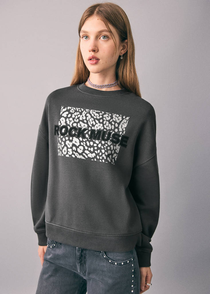 Cotton fabric. Straight design. Printed design. Animal print details. Round neck. Long sleeves. Ribbed neck, cuffs, and hem