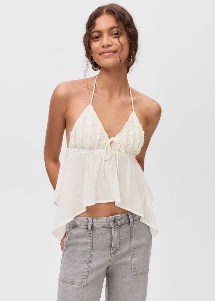 100% cotton fabric. Asymmetric design. V-neckline. Halter neck. Bow detail on the neckline. Gathered detail. Hem with asymmetrical cuts