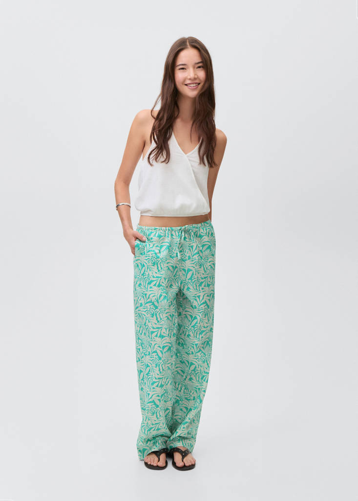 Crafted from 100% cotton fabric, this long and straight design features a leaf print. The adjustable drawstring waist allows for a personalized fit, ideal for a total look