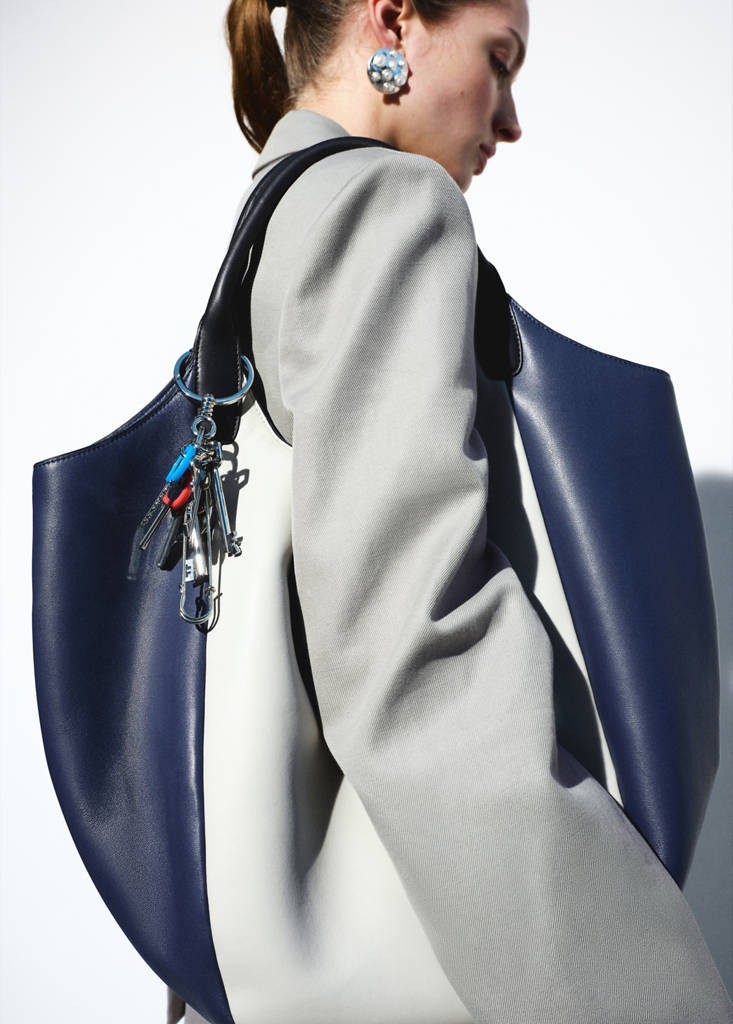 100% sheepskin. Contrast color design. Two-tone design. Two shoulder straps. Magnetic button closure. Exclusive Online. Selection Collection