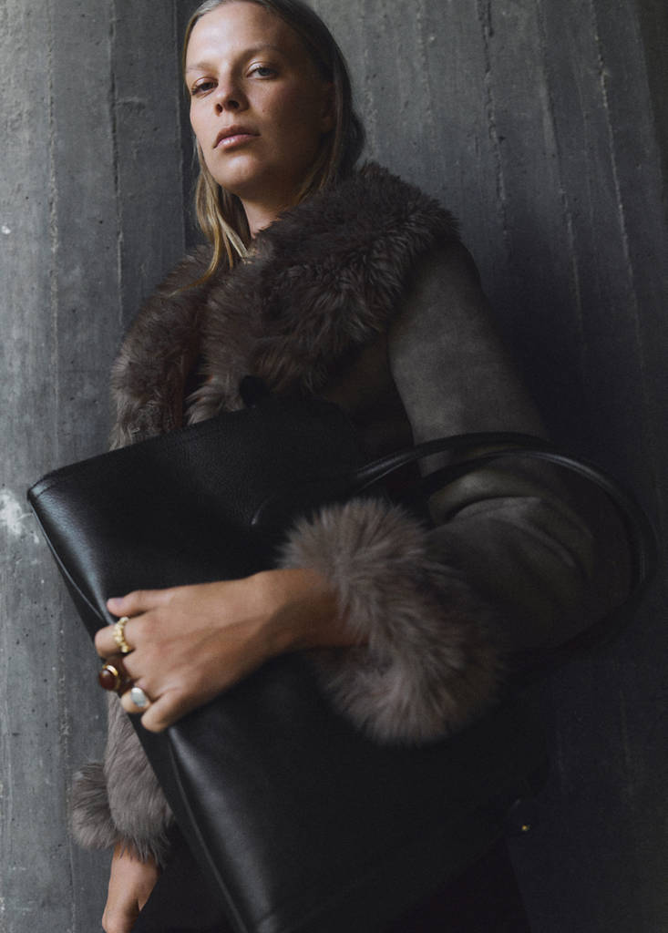 Medium size. Pebbled leather effect. Two shoulder straps. Small inner bag. Adjustable side straps with button. Hidden carabiner closure