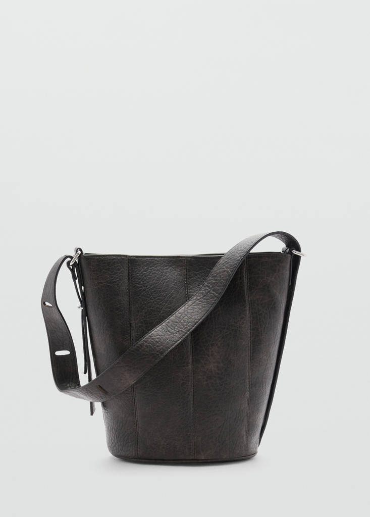 Medium size. Long adjustable strap. Inner zipped pocket. Magnetic metallic fastening. Leather effect. Bucket design