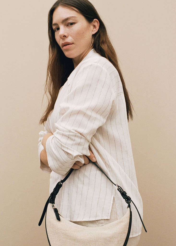 Small size. Cotton and linen blend fabric. Oval design. Shoulder strap. Adjustable buckle handle. Zipper closure