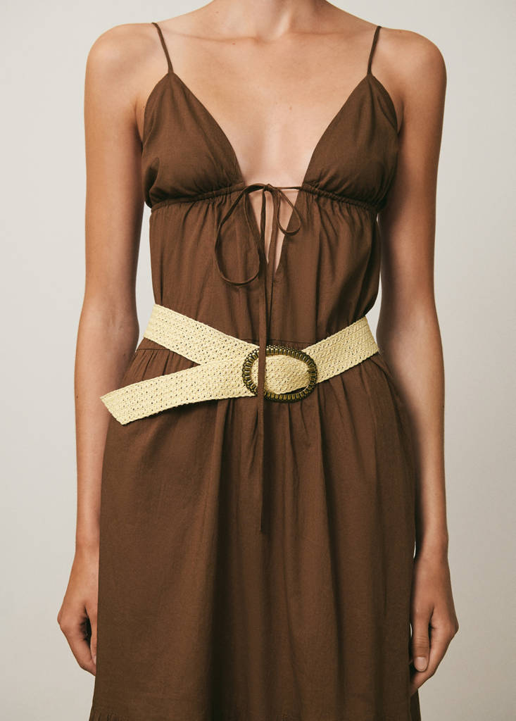 Natural fiber fabric. Metallic buckle. Buckle closure