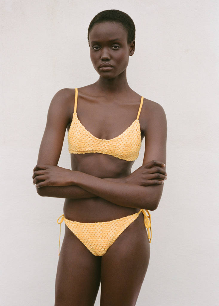 Crochet fabric. Triangular design. V-neck. Thin straps. Hook closure. Inner lining. Available set