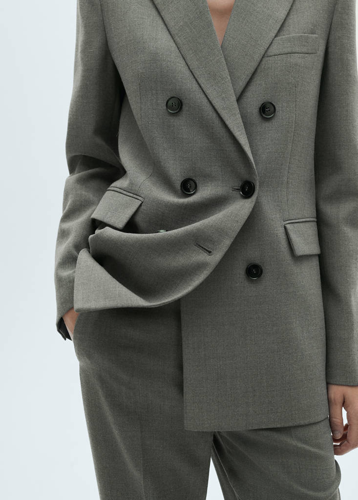 Wool mix fabric. Long design. Straight design. Two side pockets with flaps. Lapel-collar V-neck collar. Notched lapels. Long sleeves with buttoned cuffs. Chest welt pocket. Crossed design. Total look. Inner lining. Selection Collection. Front button closure