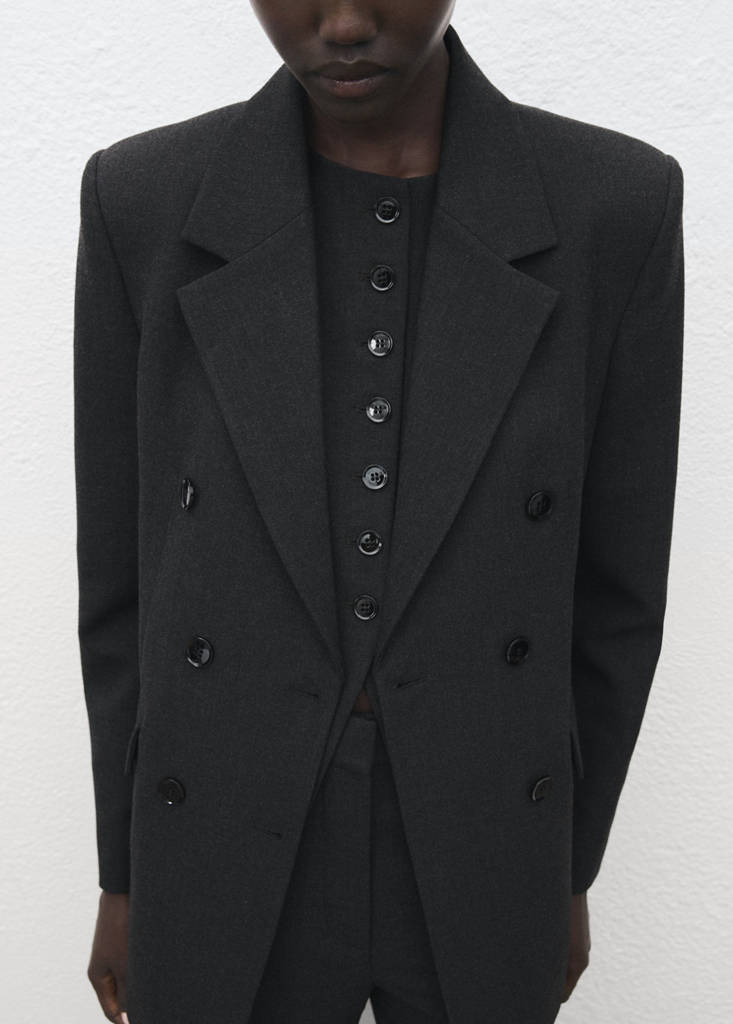Suit style. Straight design. Lapel-collar V-neck collar. Notched lapels. Long sleeves with buttoned cuffs. Two side pockets with flaps. Double button fastening. Inner lining. Back vent at the hem. Total look