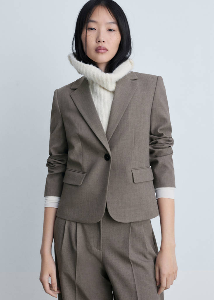Structured design. Fitted design. Lapel-collar V-neck collar. Notched lapels. Long sleeves. Buttoned cuffs. Front button closure. Side flap pockets. Inner lining. Total look