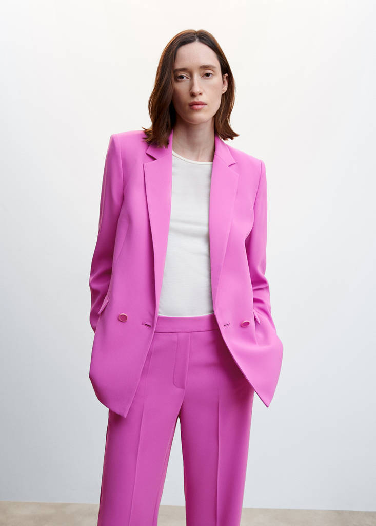 Flowy fabric. Straight design. Lapel-collar V-neck collar. Long sleeve with buttoned cuffs. Shoulder pad. Button fastening on the front. Decorative button. Back-slit hem. Inner lining. Co-ord. Plus Size Available. Party and events collection