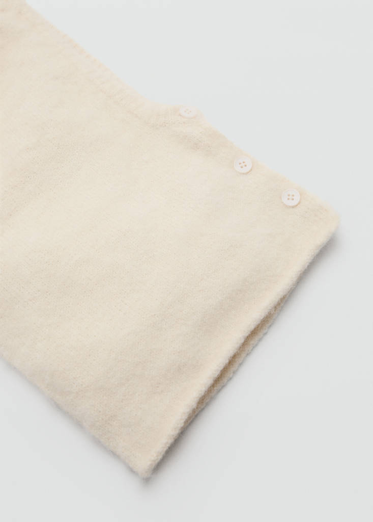 Balaclava knit buttonsCurrent price [US$ 35.99 ]US$ 35.99Select a colourEcruSelect your sizeOne sizeNot available. I want it!Notify meAdd to WishlistSee lookFree shipping to storeKnit fabric. Button closureDetails, composition and careStore availabilityMango StylistAsk about deliveries, returns and moreAssistant