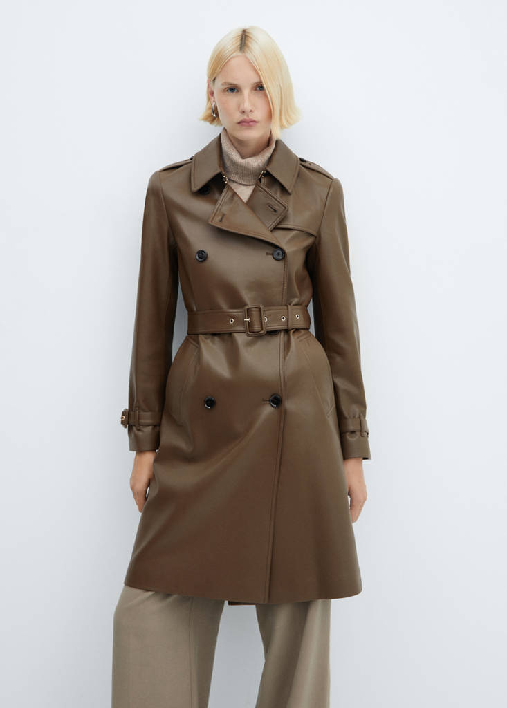 Leather effect. Straight design. Crossed design. Medium design. Notched lapel collar. Long sleeves. Loops on the cuffs. Two side pockets. Adjustable belt. Back vent at the hem. Button closure at the front. Tortoiseshell effect buttons. Inner lining. Office looks