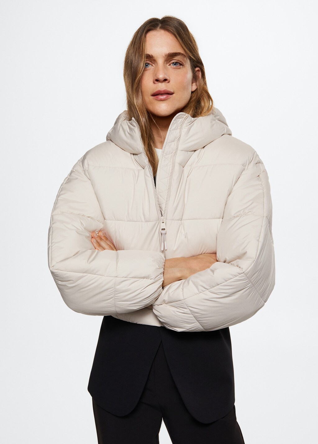 Medium quilted coat. Water-repellent: The durable finish of this garment protects against light rain, repelling contact with water and raindrops. 100% recycled polyester filling. Quilted design. Short design. Straight design. Turtleneck. Long sleeve with elastic cuffs. Hood. Zip fastening on the front section. Two side pockets. Inner lining.