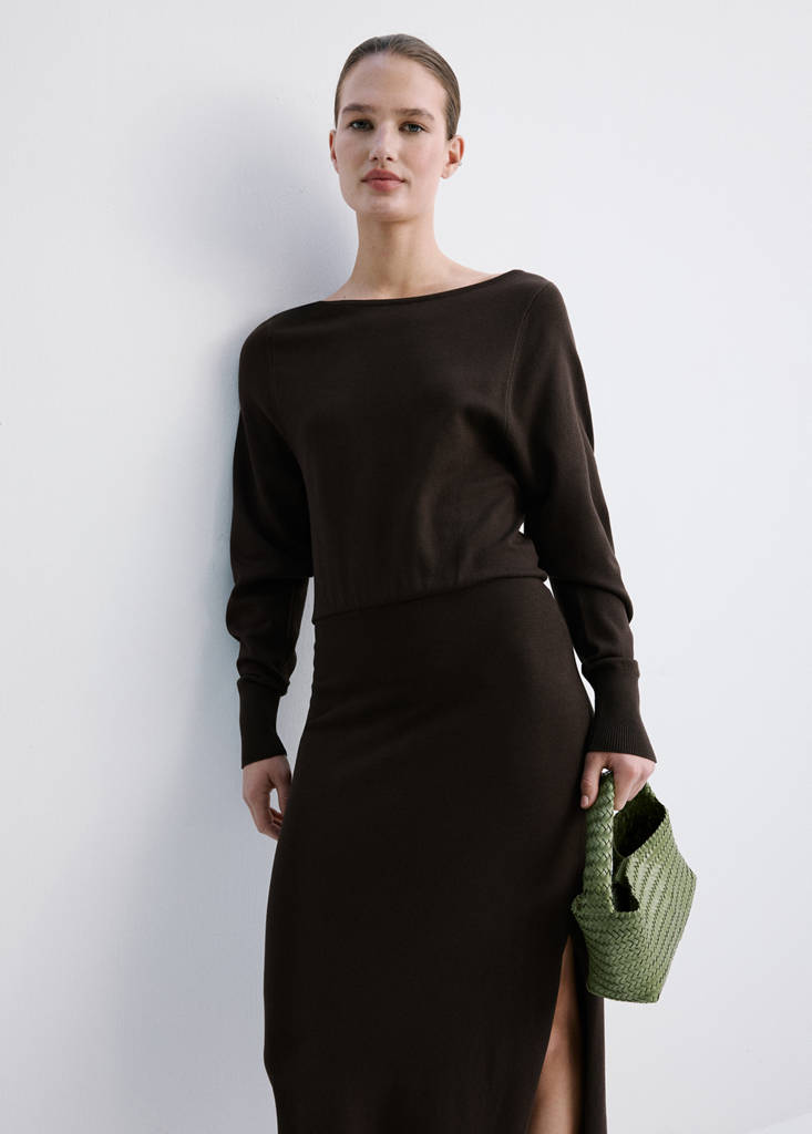 Fine knit fabric. Midi design. A-line design. Boat neck. Long sleeves. Elastic gathered waist. No closure