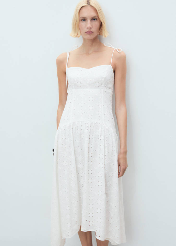 100% cotton fabric. Straight design. Midi design. Die-cut design. Low-cut Neckline. Sleeveless. Thin straps with tie closure. Side zipper closure. 100% cotton lining. This garment is part of our casual collection, designed to stylishly accompany you in your day-to-day life