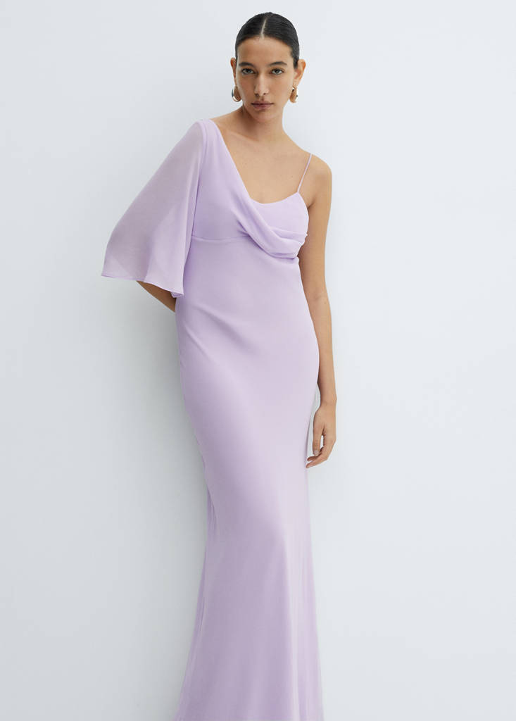 Fluid fabric. Straight design. Long design. Asymmetric design. Sweetheart neckline. A sleeve. Three quarter flared sleeve. Thin strap. No closure. Draped detail. Party, ceremony, and communion collection. This garment is part of our event collection, designed to make you the perfect guest at any party, wedding, or ceremony.