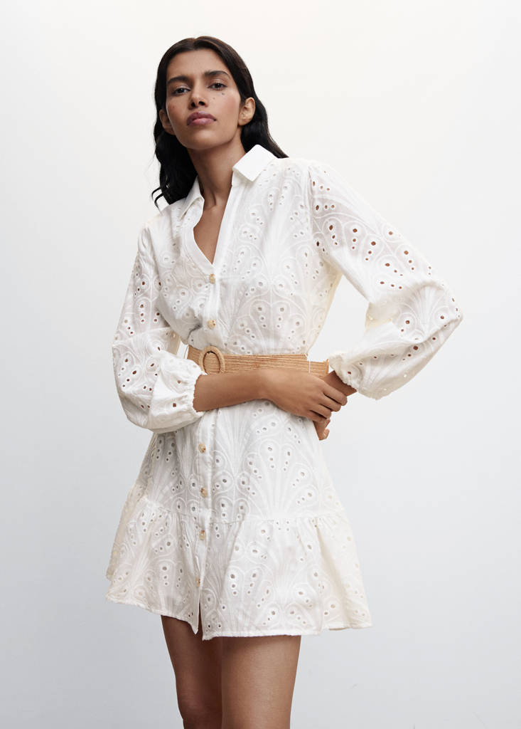 100% cotton fabric. Shirt-style. Openwork design. Evasé design. Short design. Shirt-style collar. Long puffed sleeves. Button fastening on the front section. Full skirt. Decorative belt. Plus Size Available