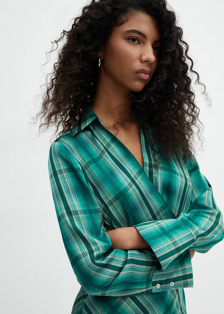 Fluid fabric. Satin weave. Short design. A-line design. Checkered design. Shirt collar. Crossed V-neck. Long sleeves with buttoned cuffs. Tie closure at the back. Inner lining. Party, ceremony, and communion collection