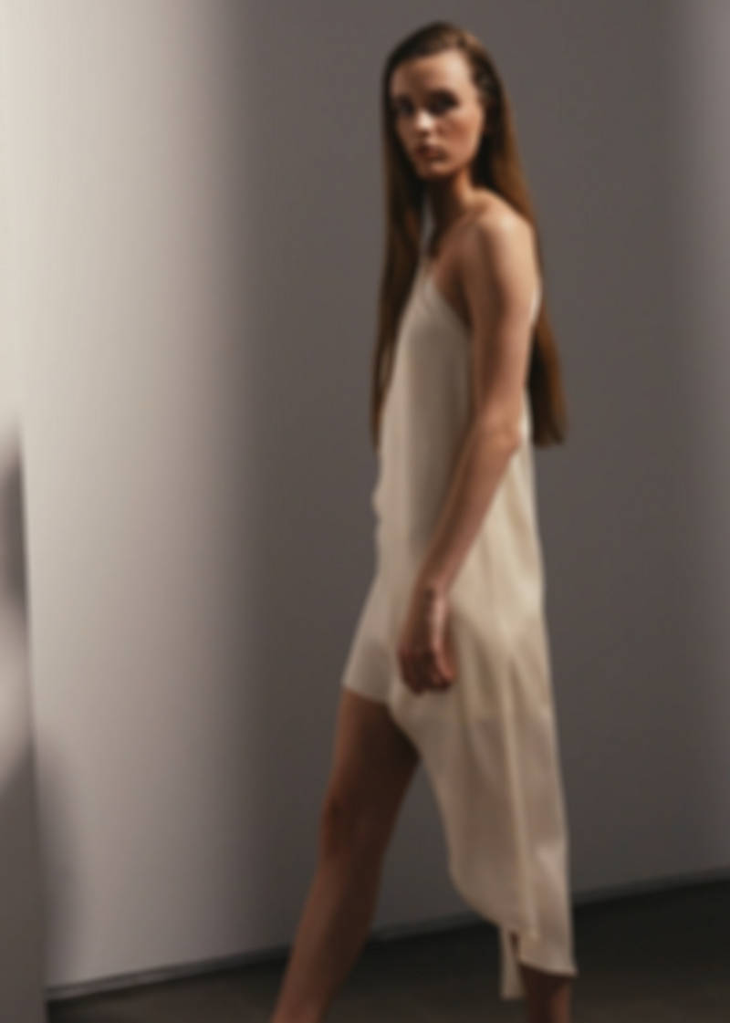 This dress combines tradition and modernity with a flowing fabric that drapes elegantly and naturally. Its asymmetrical cut, currently trending, flatters the silhouette and is ideal for both daytime and evening events. Satin weave. Short design. Asymmetric design. Short sleeves. Online Exclusive. Made in Portugal. Side zipper closure. Unlined. Items from the CAPSULE collection can be exchanged or returned within 14 days from the date of shipment. This garment is part of our party and event collection, designed to elevate your looks for special occasions
