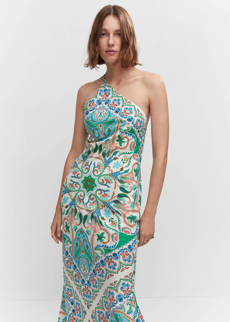 Flowy fabric. Long design. Straight design. Paisley print. Halter neck. Thin straps. Open back. Bow fastening on the back. Party and events collection