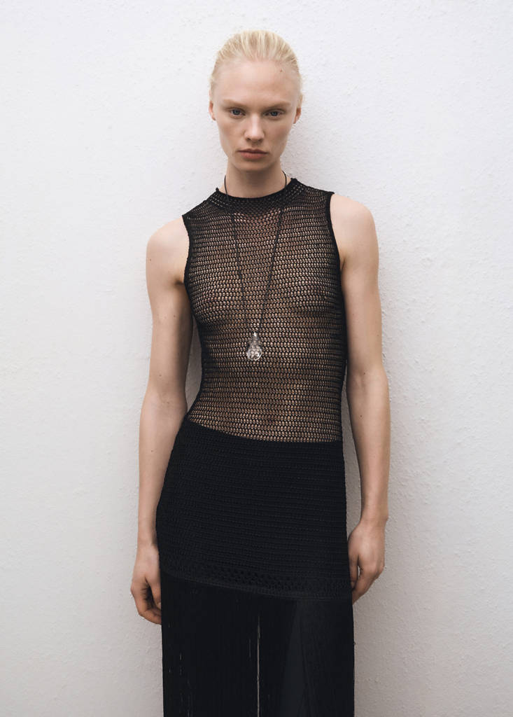 Openwork knit. Semi-transparent design. Fitted design. Mock neck. Sleeveless. Fringe finish. No closure. Selection Collection