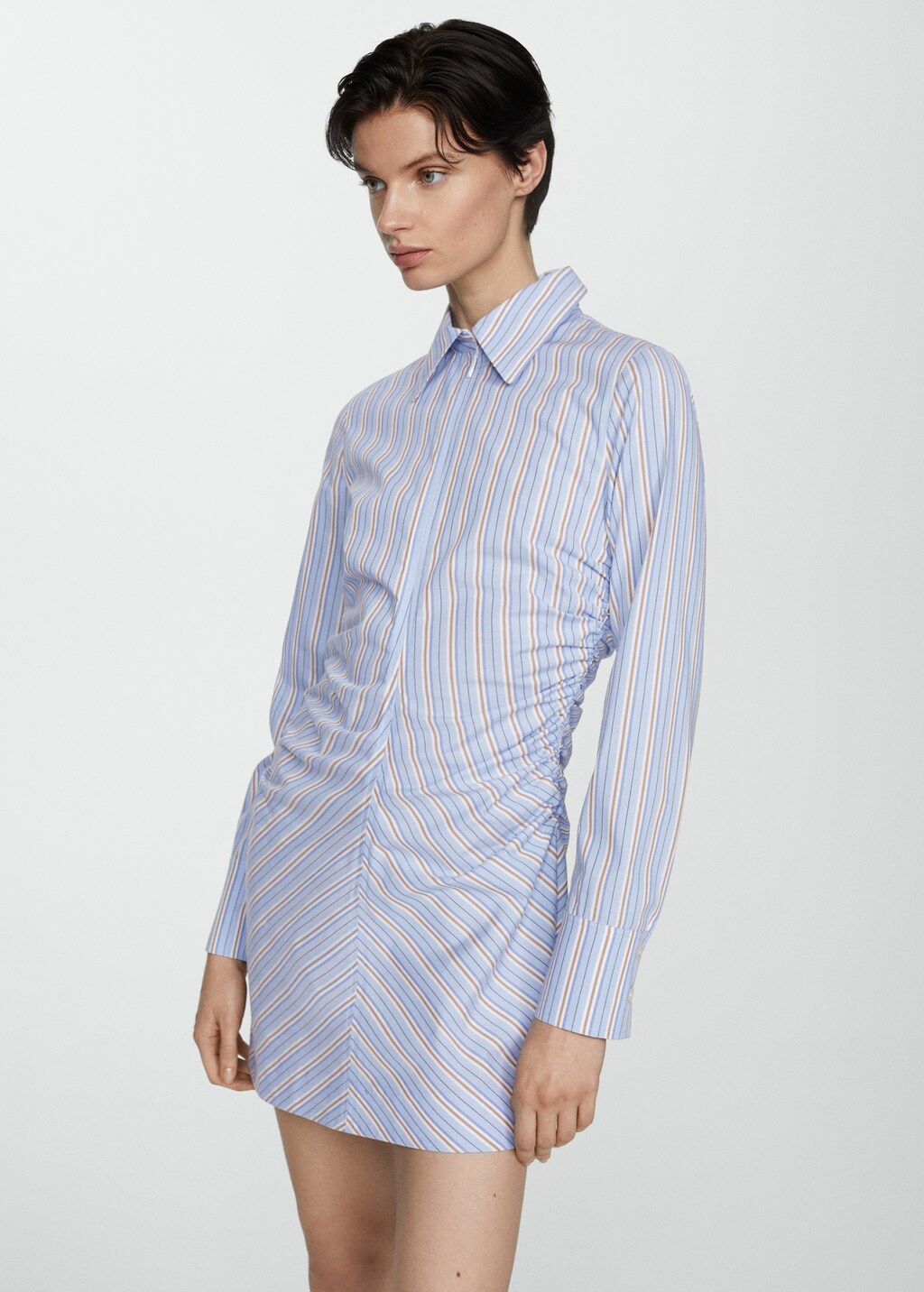 Cotton blend fabric. Short design. Striped print. Shirt Collar. Long sleeve with buttoned cuffs. Unlined. Invisible front zipper fastening. Gathered detail. Fitted design.