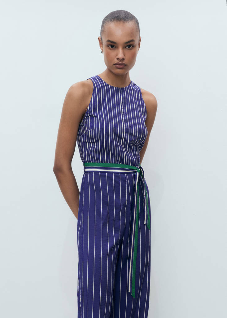 Long design. Straight design. Striped print. Round neck. Sleeveless. Belt loops. Removable belt. Back zipper closure