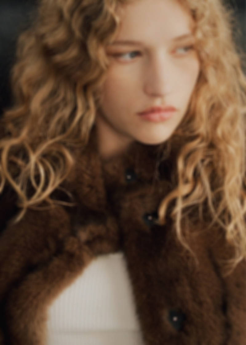 Fur effect. Straight design. High neck. Long sleeves with elastic cuffs. Two pockets with flaps on the front. Front button closure. Inner lining