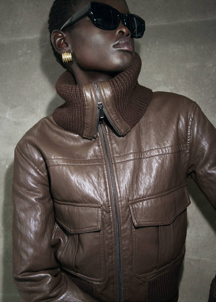 Leather effect. Crop design. Rolled neck. Long sleeves with elastic cuffs. Two patch pockets and front flap pockets. Ribbed neck, cuffs and hem. Front zipper closure. Inner lining