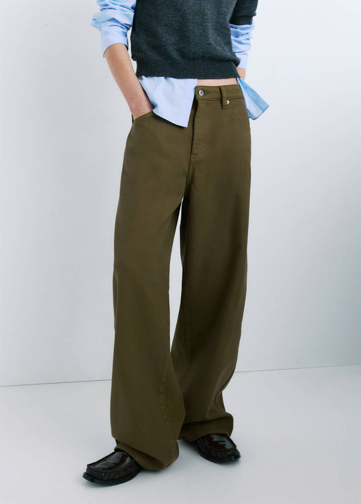 Denim-style cotton fabric. Long design. Balloon design. Barrel style. Low waist. Belt loops. Five pockets. Front zipper and button closure