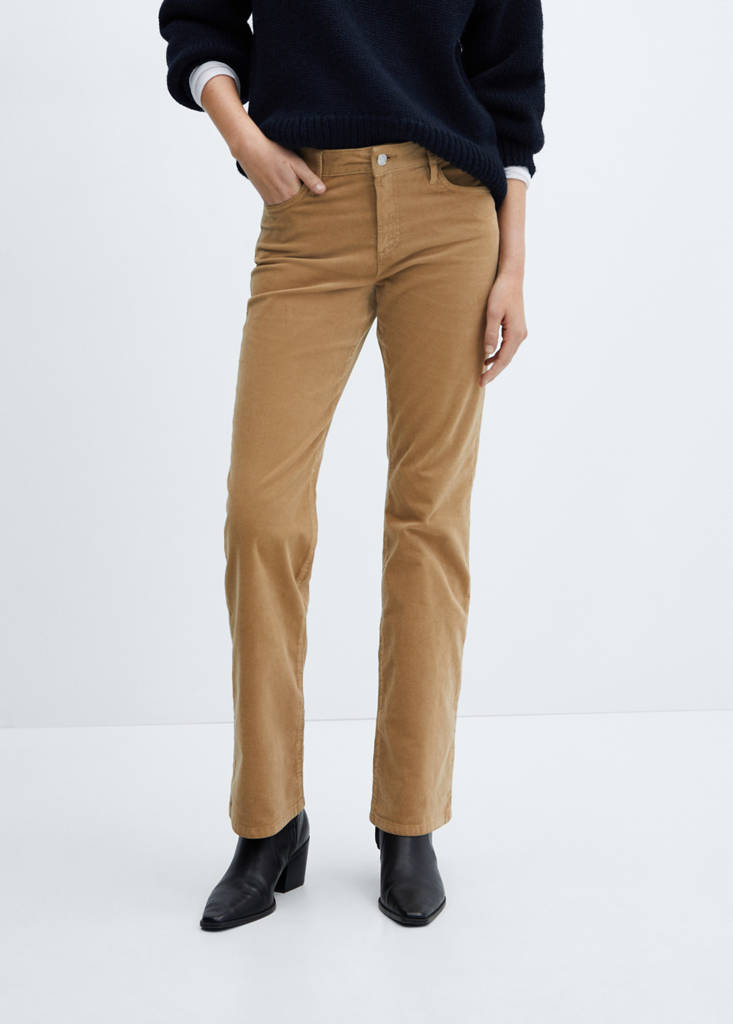 Corduroy fabric. Bell design. Flare design. Mid-rise. Belt loops. Five pockets. Zip and button closure. Inseam 33.1 in. Flared design. 100% cotton fabric