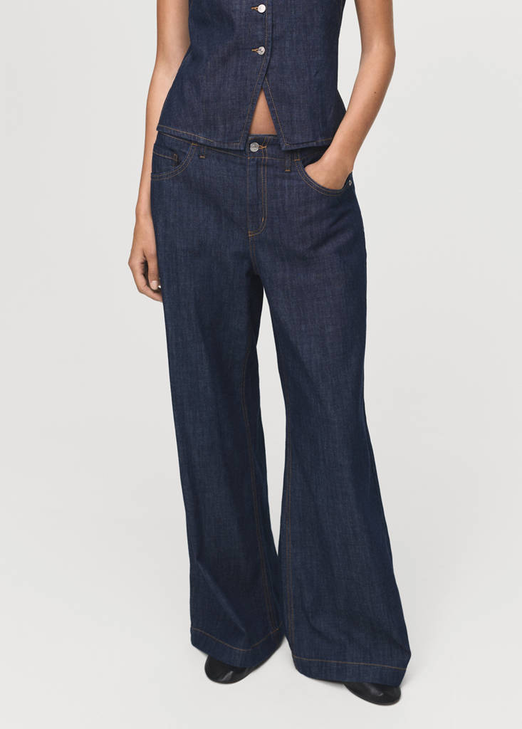 Denim-style cotton fabric. Long design. Wide leg design. Mid-rise. Belt loops. Five pockets. Contrast stitching. Button and zipper fastening. Total look