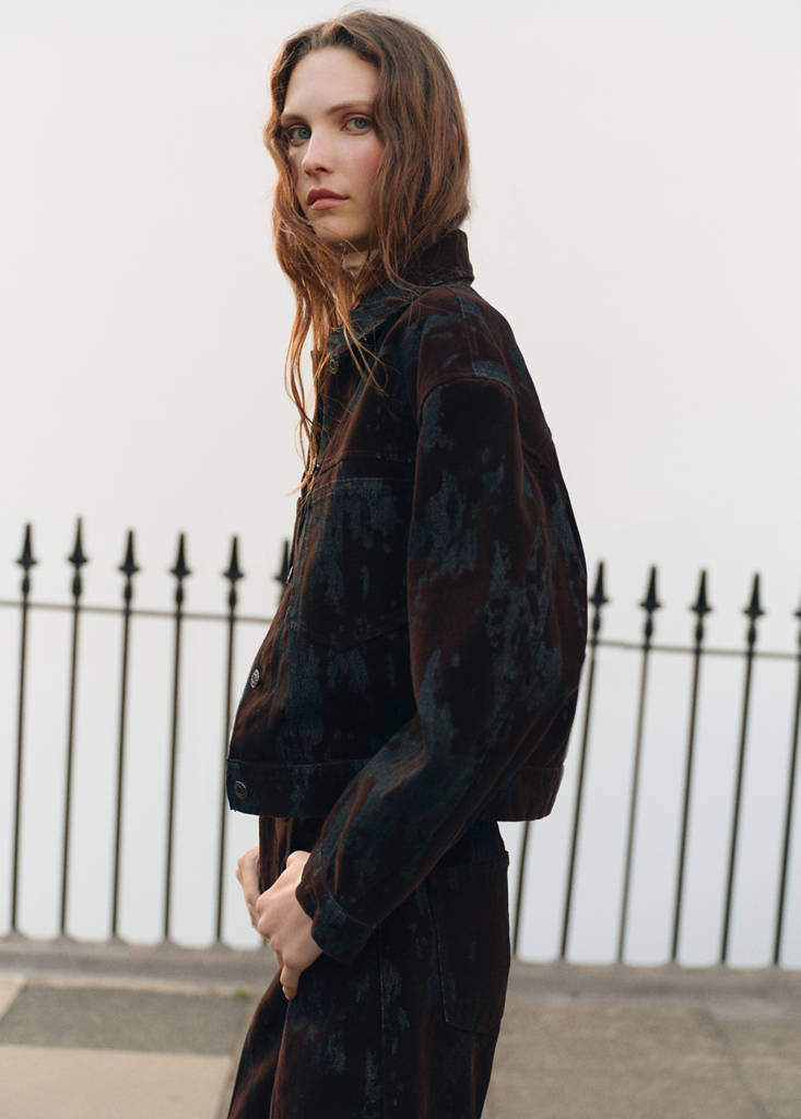 Devore fabric. Long design. Wide leg design. High-rise. Belt loops. Five pockets. Button and zipper fastening. Total look