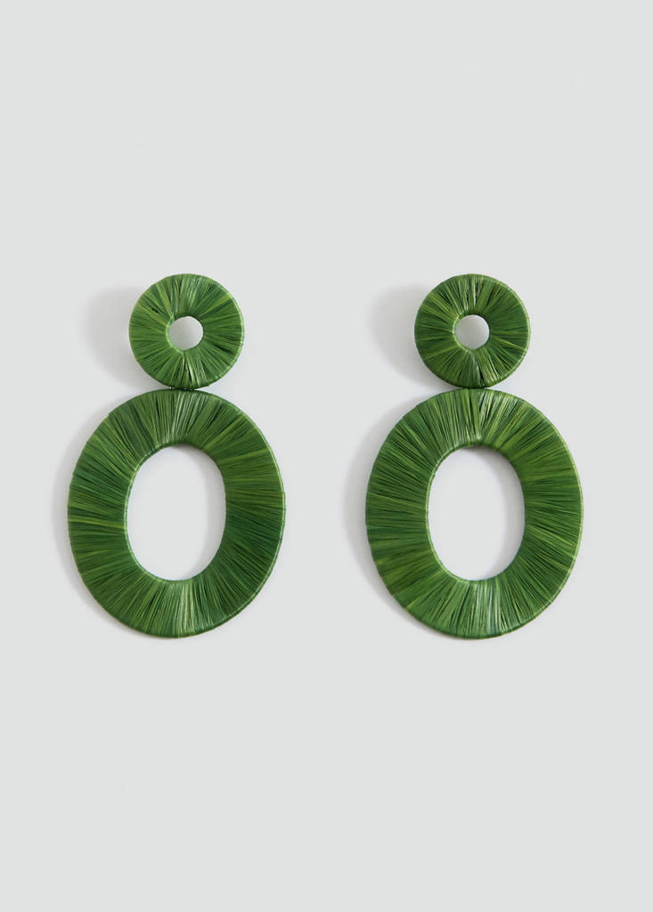 Natural fiber circular-design earringsCurrent price [US$ 35.99 ]US$ 35.99Select a colourPastel GreenSelect your sizeOne sizeNot available. I want it!Notify meAdd to WishlistSee lookFree shipping to storeLarge size. Circular design. Metal snap closureDetails, composition and careStore availabilityMango StylistAsk about deliveries, returns and moreAssistant