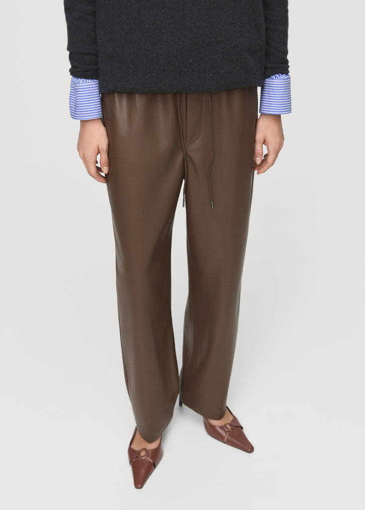 Leather effect. Long design. Straight design. Mid-rise. Elastic waistband with adjustable drawstring. Two side pockets. No closure. Inner lining. Available Plus