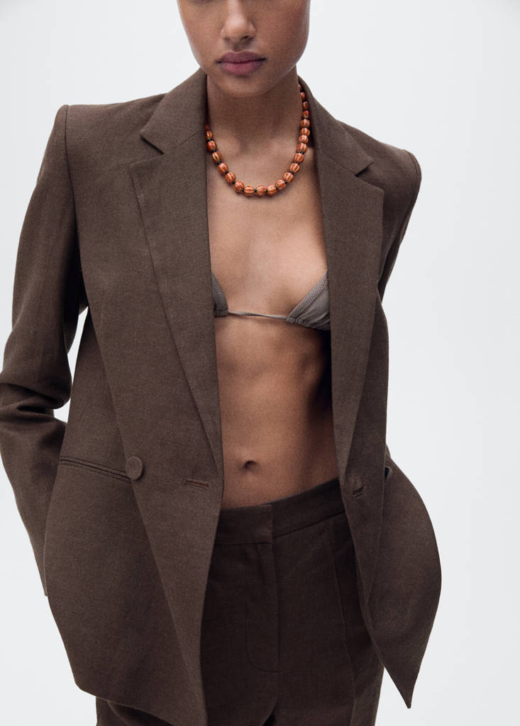 100% Linen. Suit style. Straight design. Two side pockets. Concealed button, hook and zip fastening. Elastic band on the back. Inner lining. Total look. Office looks