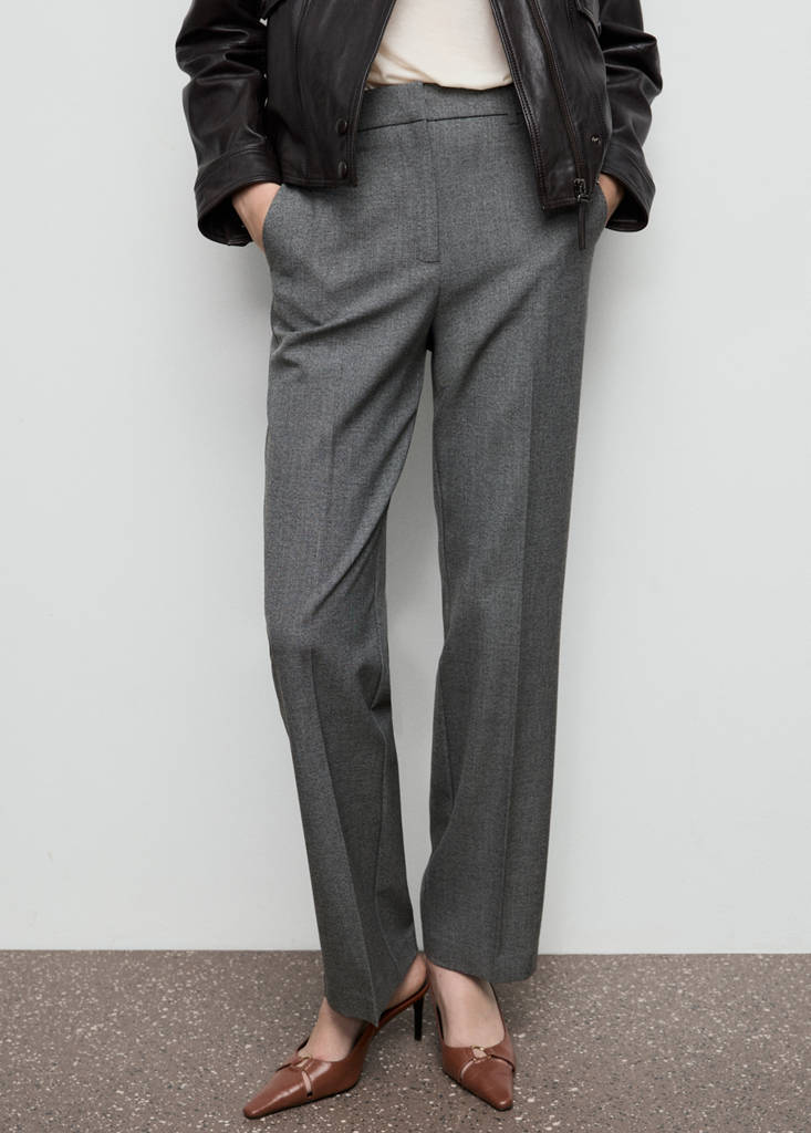 Lightweight fabric. Straight design. Long design. Mid-rise. Two side pockets. Zipper, button and concealed hook-and-loop fastener with placket. Belt loops. Inner lining