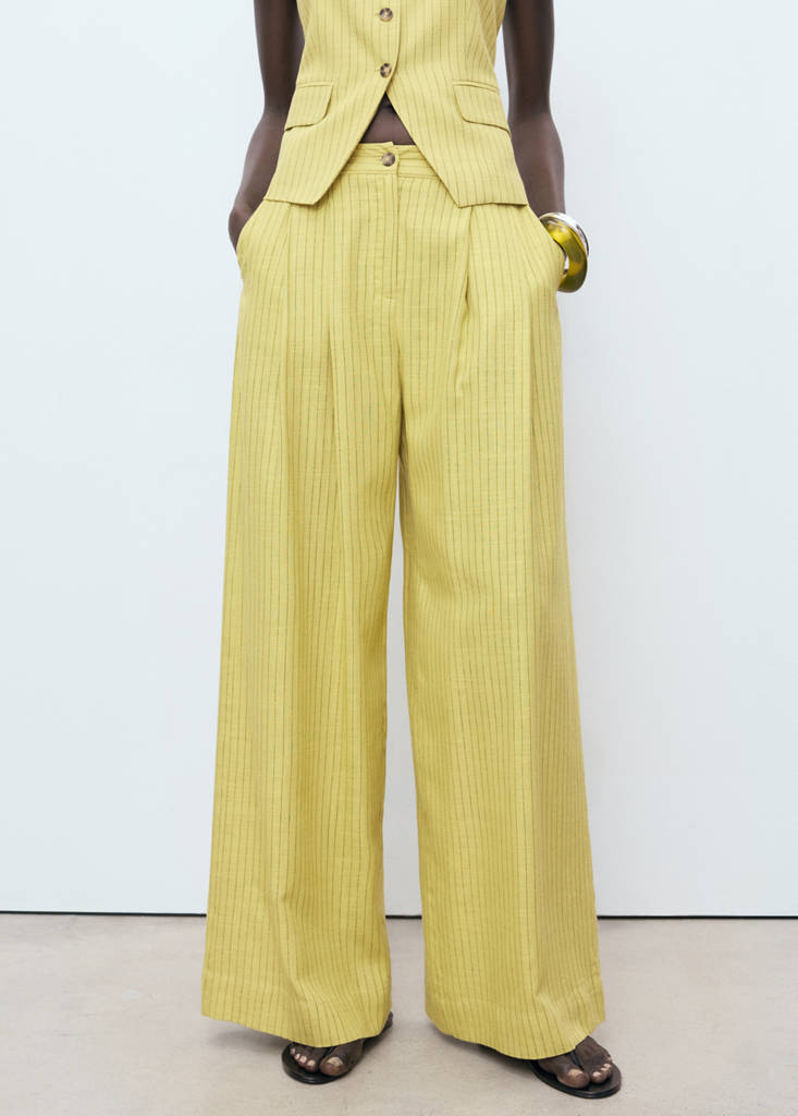 Linen and lyocell blend fabric. Long design. Straight design. Striped design. High-rise. Dart detail. Two side pockets. Button and zipper fastening. Total look