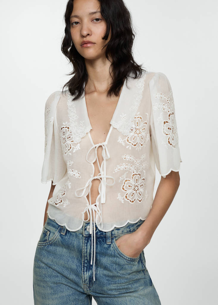Fluid fabric. Embroidered fabric. Straight design. Crop design. Shirt collar. Short sleeves. Bow closure on the front. Scalloped edges