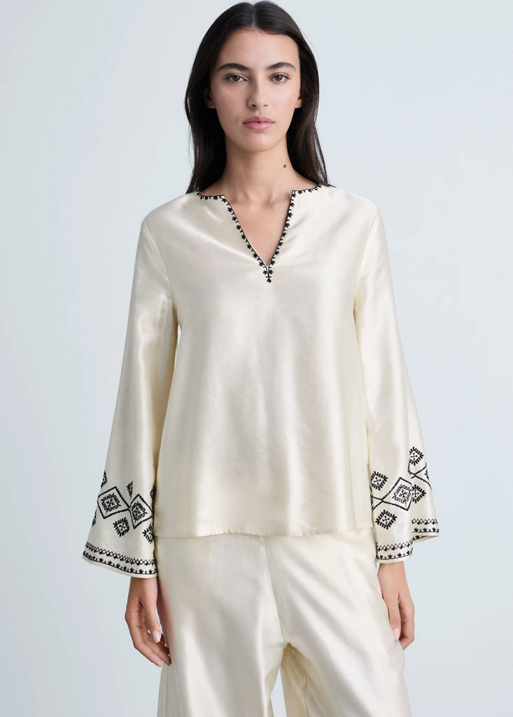 Satin weave. Straight design. V-neck. Long sleeves. No closure. Embroidered details. Total look