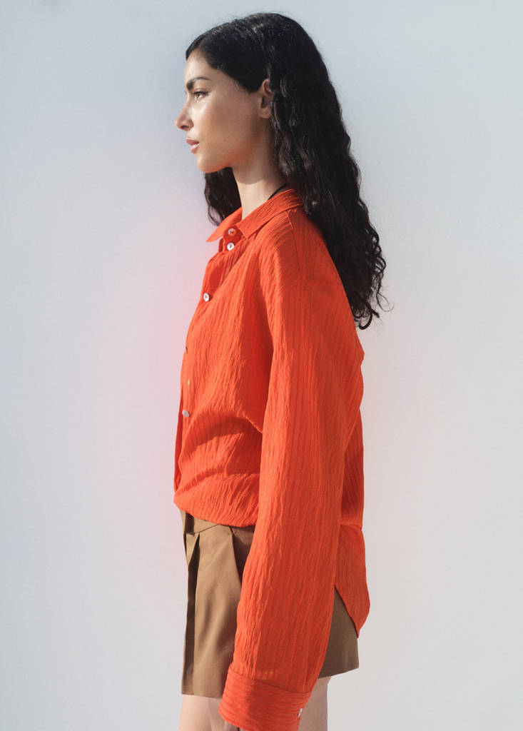 With crinkled-effect fabric, this garment features a subtly oversized design with a shirt collar. It comes with matching pants to create a fluid total look