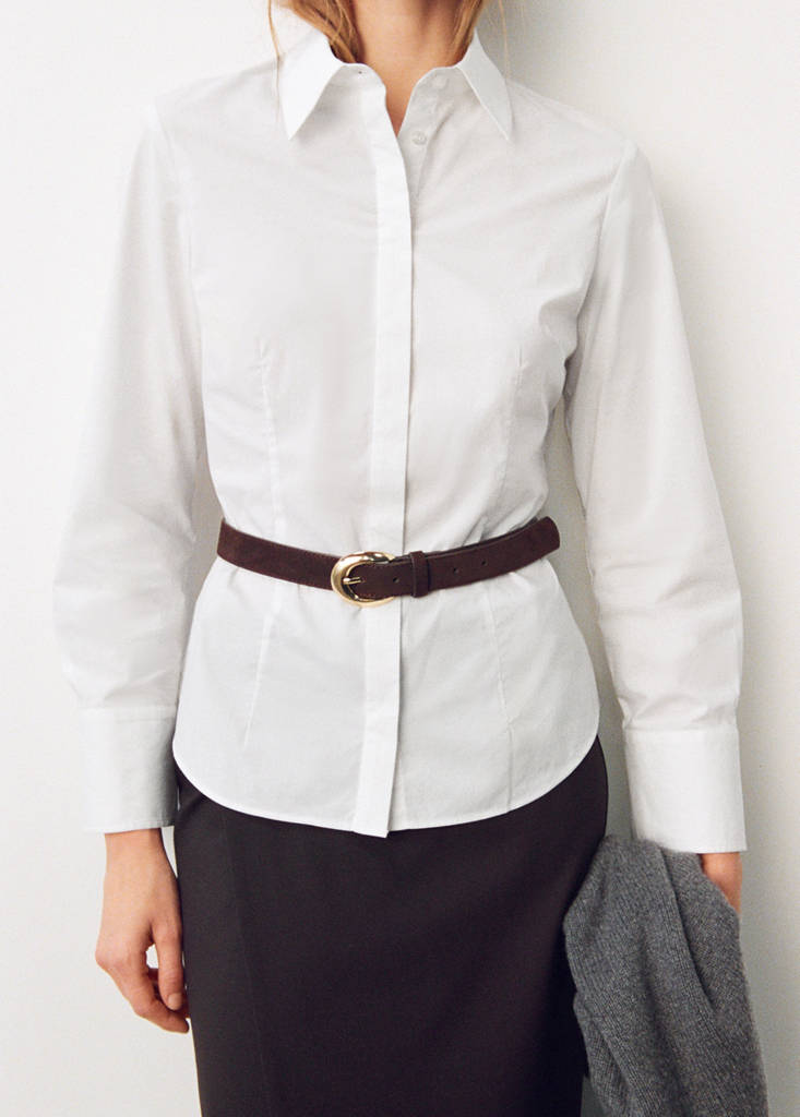 Crafted from cotton poplin fabric, this garment features a tailored design that enhances the silhouette. It has a shirt collar and long sleeves with buttoned cuffs