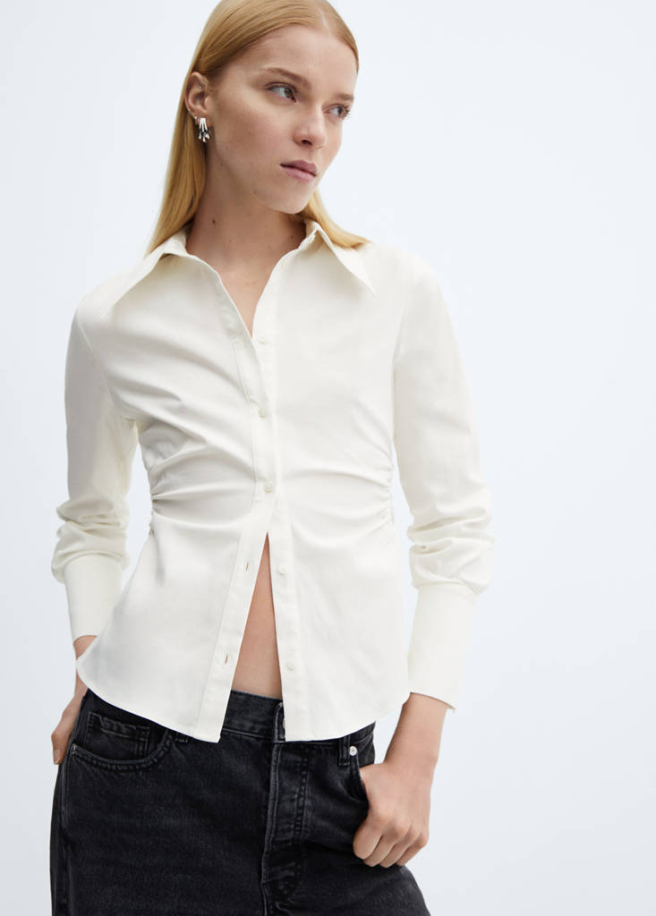 Slim-fit velvet jacketCurrent price [US$ 59.99 ]US$ 59.99Select a colourOff WhiteThe model is wearing size 4 (EUR S) and is 6'2" tall.Select your size0 (EUR XXS)Not available. I want it!2 (EUR XS)Not available. I want it!4 (EUR S)Not available. I want it!6 (EUR M)Not available. I want it!8 (EUR L)Not available. I want it!10 (EUR XL)Not available. I want it!12 (EUR XXL)Not available. I want it!DimensionsNotify meAdd to WishlistSee lookFree shipping to storeFluid fabric. Shirt collar. Long sleeves with buttoned cuffs. Ruched details. Office looks. Fitted design. Front button closureDetails, composition and careStore availabilityMango StylistAsk about deliveries, returns and moreAssistant