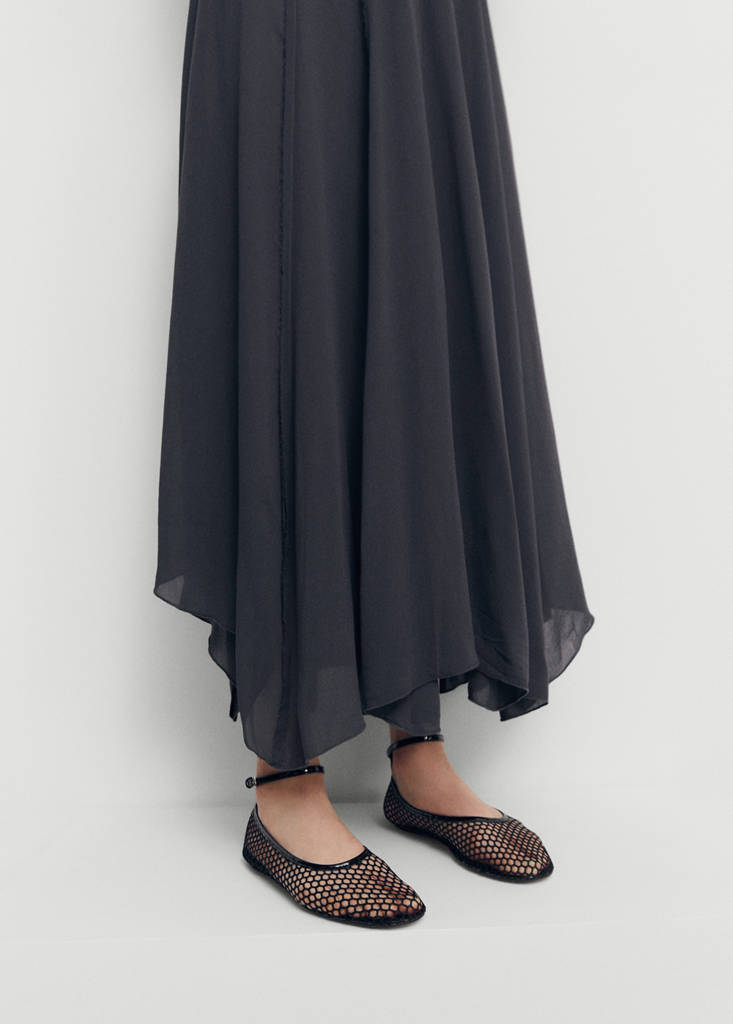 Mesh fabric. Fishnet design. Round toe. Flat. Ankle bracelet. Buckle closure. Inner lining. Selection Collection