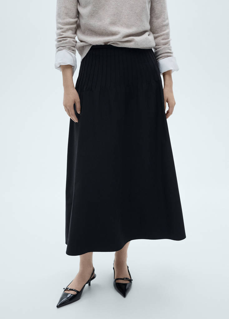 Flared skirt with pleated detailCurrent price [US$ 99.99 ]US$ 99.99Select a colourBlackThe model is wearing size S and is 5'9" tall.Select your sizeXSNot available. I want it!SNot available. I want it!MNot available. I want it!LNot available. I want it!XLNot available. I want it!DimensionsNotify meAdd to WishlistSee lookFree shipping to storeCotton blend fabric. A-line design. Long design. High-rise. Side zipper closure. Dart detailDetails, composition and careStore availabilityMango StylistAsk about deliveries, returns and moreAssistant