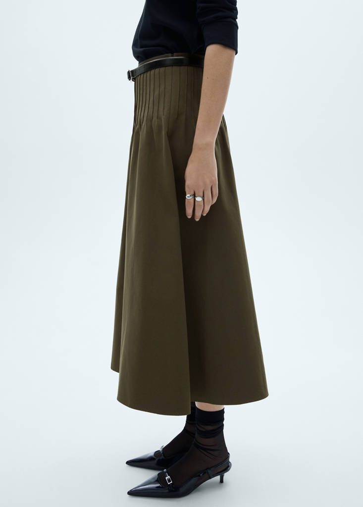 Flared skirt with pleated detailCurrent price [US$ 99.99 ]US$ 99.99Select a colourKhakiThe model is wearing size S and is 5'9" tall.Select your sizeXSNot available. I want it!SNot available. I want it!MNot available. I want it!LNot available. I want it!XLNot available. I want it!DimensionsNotify meAdd to WishlistSee lookFree shipping to storeCotton blend fabric. A-line design. Long design. High-rise. Side zipper closure. Dart detailDetails, composition and careStore availabilityMango StylistAsk about deliveries, returns and moreAssistant