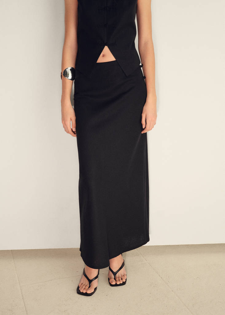 Linen-blend straight skirtCurrent price [US$ 79.99 ]US$ 79.99Select a colourBlackThe model is wearing size S and is 5'10" tall.Select your sizeXXSNot available. I want it!XSNot available. I want it!SNot available. I want it!MNot available. I want it!LNot available. I want it!XLNot available. I want it!XXLNot available. I want it!DimensionsNotify meAdd to WishlistSee lookFree shipping to storeCotton and linen blend fabric. Long design. Straight design. Mid-rise. Side button closure. Total lookDetails, composition and careStore availabilityMango StylistAsk about deliveries, returns and moreAssistant